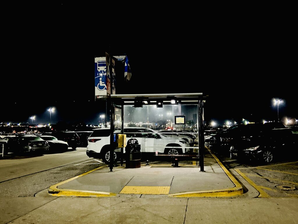 Finally, like those pristine white Mormon temple towers on 495, I see the sign for Long Term Parking and go park my car. I then rush out with my umbrella and suitcase toward the closest shuttle bus stop, “A14.” Now this bus stop is a glass rectangular structure, and inside are wall-to-wall, soaking-wet people, standing like wonder bread slices – expressionless and in total silence.